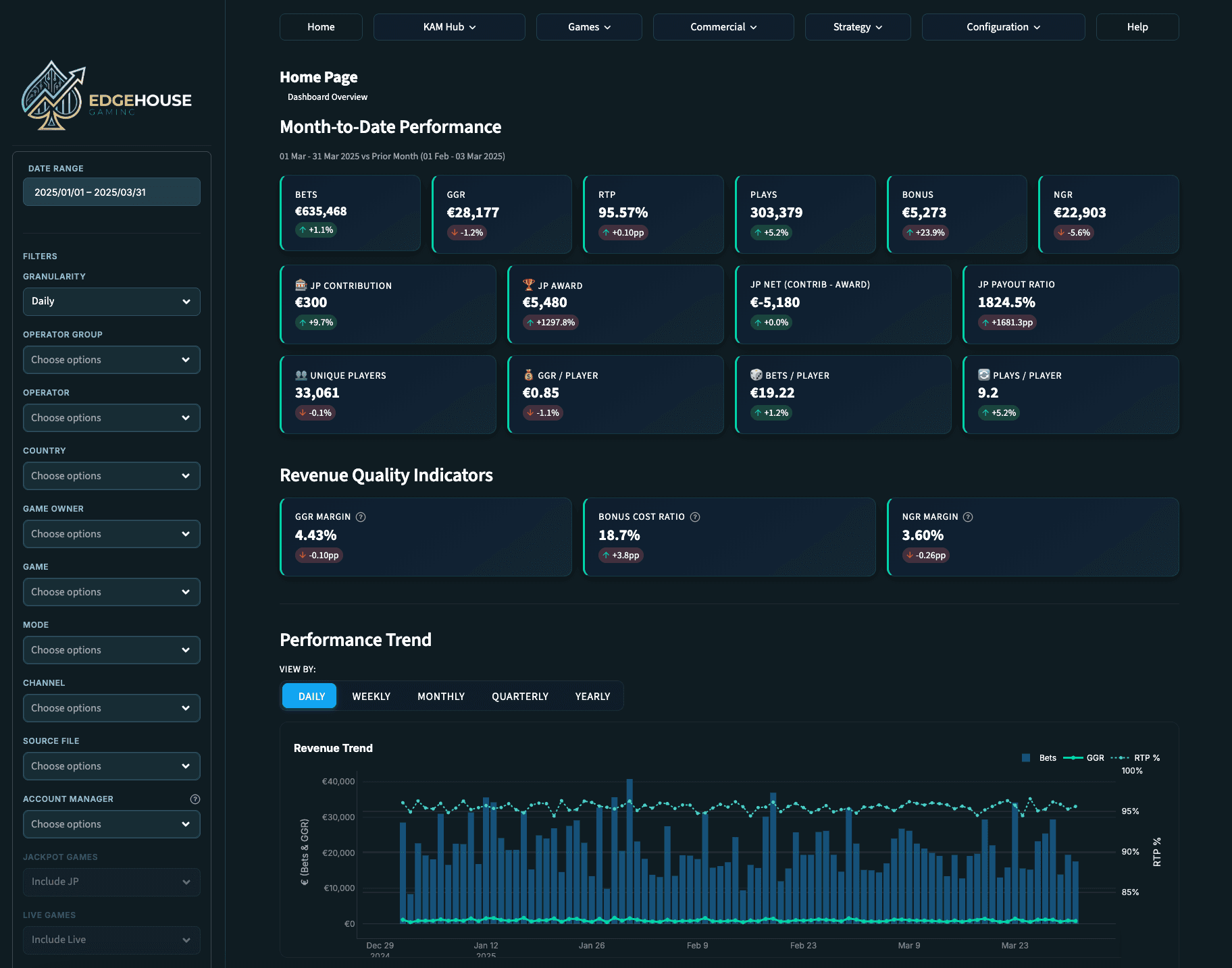 Edgehouse Gaming equips commercial teams with instant data, automated reporting, and actionable insights. Reclaim your time and eliminate hours of manual work.