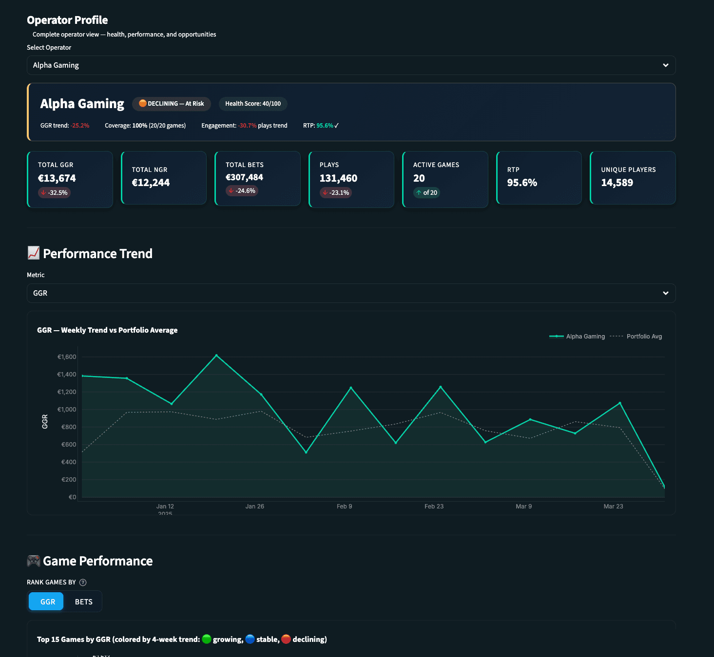 A complete 360-degree view of each operator's health. Revenue, game mix, activity trends, health score indicators, game coverage percentage, and unique players, all in one place. Weekly GGR trend lines compared against the portfolio average show you instantly whether an operator is outperforming or underperforming.