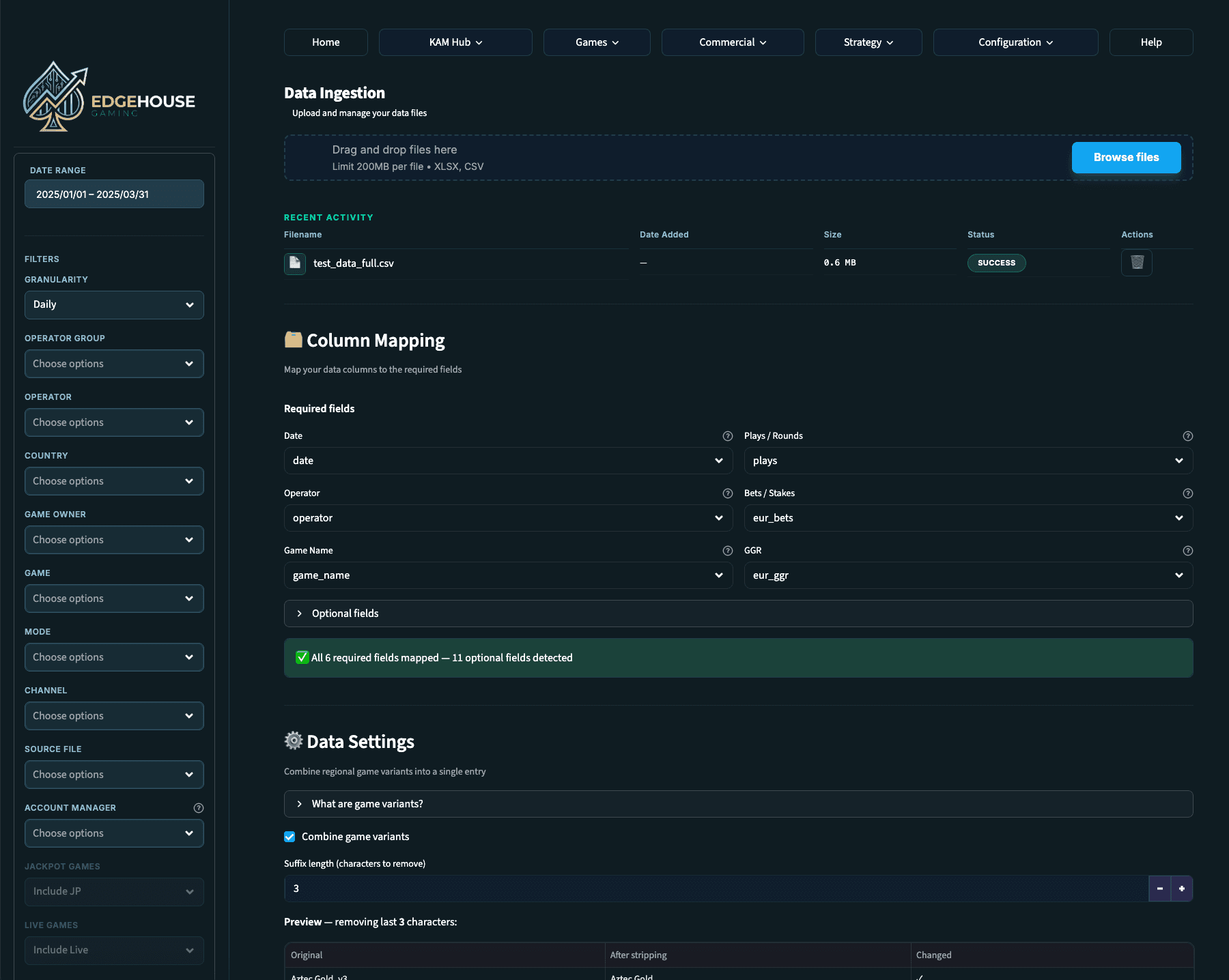 The Data Ingestion page is your starting point for getting your own data into Edgehouse Gaming. The dashboard accepts CSV and Excel files up to 200MB and automatically detects common column names.
